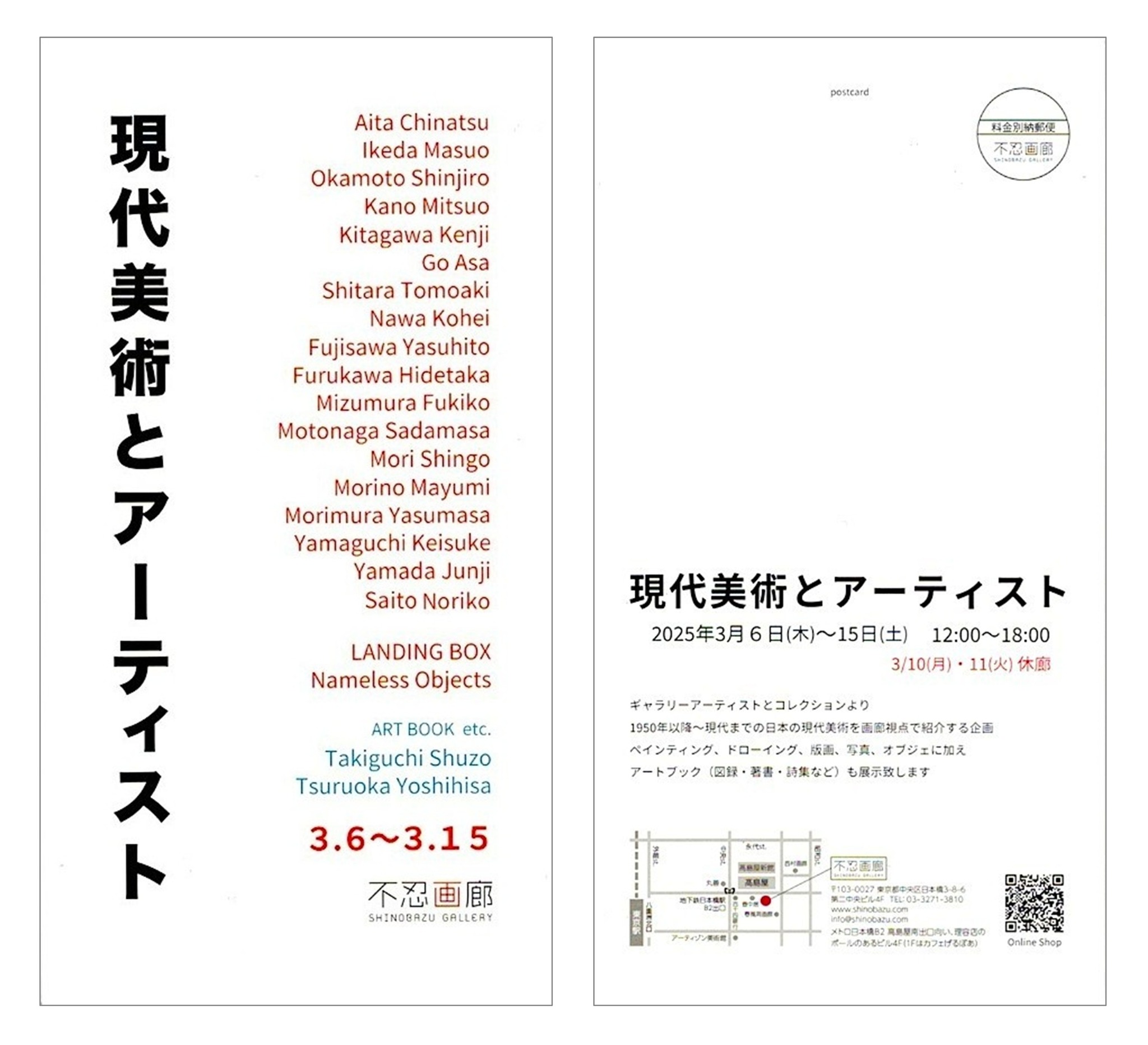 ギャラリーアーティストとコレクションより、1950年以降〜現代までの日本の現代美術を画廊視点で紹介する特別企画展。ペインティング、ドローイング、版画、写真、オブジェに加え、アートブック(図録・著書・詩集など)も展示いたします。
